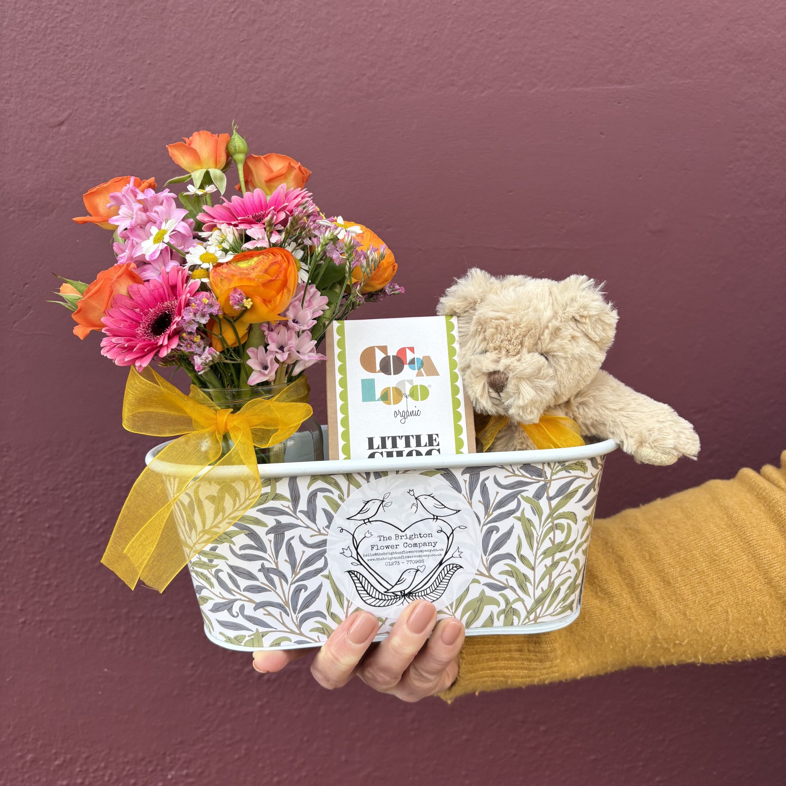 Displayed in a William Morris patterned metal tub, this easter gift set includes a beautiful jam jar of seasonal blooms, a very cute teddy and delicious chocolate chicks!