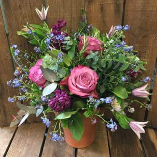This wild and whimsical bouquet will brighten anyones day. With its beautiful soft mauves and lilacs, dotted with rosemary and other delicious garden herbs, this posy is a perfect mix of gentle florals – a delight for all the senses!